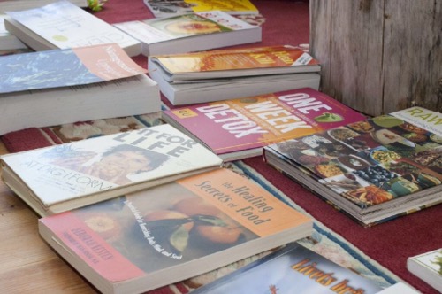 Utöver den gedigna utbildningspärmen som är fylld med material finns ett stort bibliotek av raw food böcker för att läsa i.